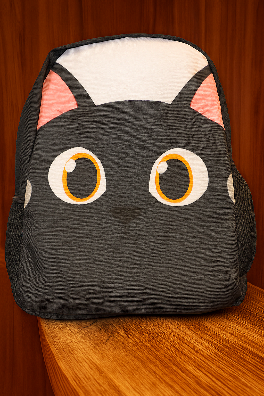 Mochila personalizable de gatito negro. Espaciosa, ligera y resistente, cuenta con correas ajustables y portabotellas. Medidas 43 cm x 30 cm x 13 cm.