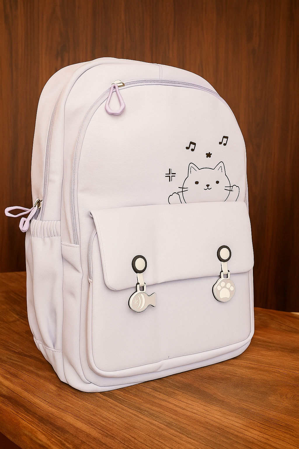- Diseño Kawaii y Funcional: Presenta un encantador dibujo de un gato asomándose por el bolsillo frontal, complementado con notas musicales y un símbolo de sostenido. Incluye lindos colgantes (un pez y una huella de gato) que añaden un toque único.